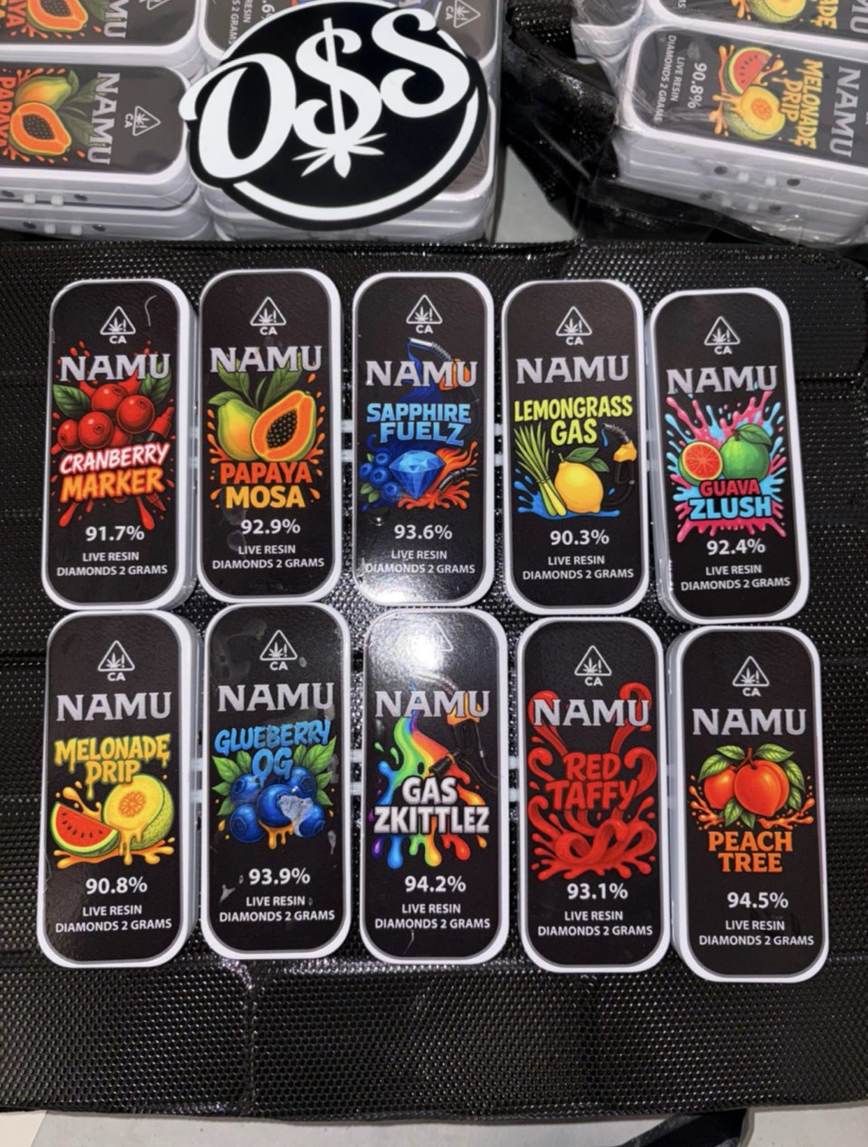 guava zlush (hybrid), melonade drip (sativa), glueberry OG (indica), lemongrass gas (hybrid), papaya mosa (indica), peach tree (sativa), red taffy (indica), gas zkittlez (indica), cranberry marker (hybrid), sapphire fuelz (indica), 10 pack mixed, 25 pack mixed, 50 pack mixed, 100 pack mixed